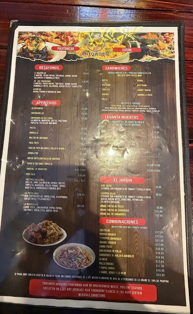 Antojitos Navidenos offers a diverse menu highlighting fusion cuisine. From empanadas and alcapurrias as appetizers to hearty main dishes like Ropa Vieja, options abound. Seafood lovers can savor octopus or mixed seafood cups. Fried pork and chicken options appeal to various tastes. Kids enjoy a dedicated menu with favorites like chicken nuggets. Desserts, especially the flan and tres leches, deliver a sweet ending. Each plate combines tradition and innovation for a truly unique dining experience.